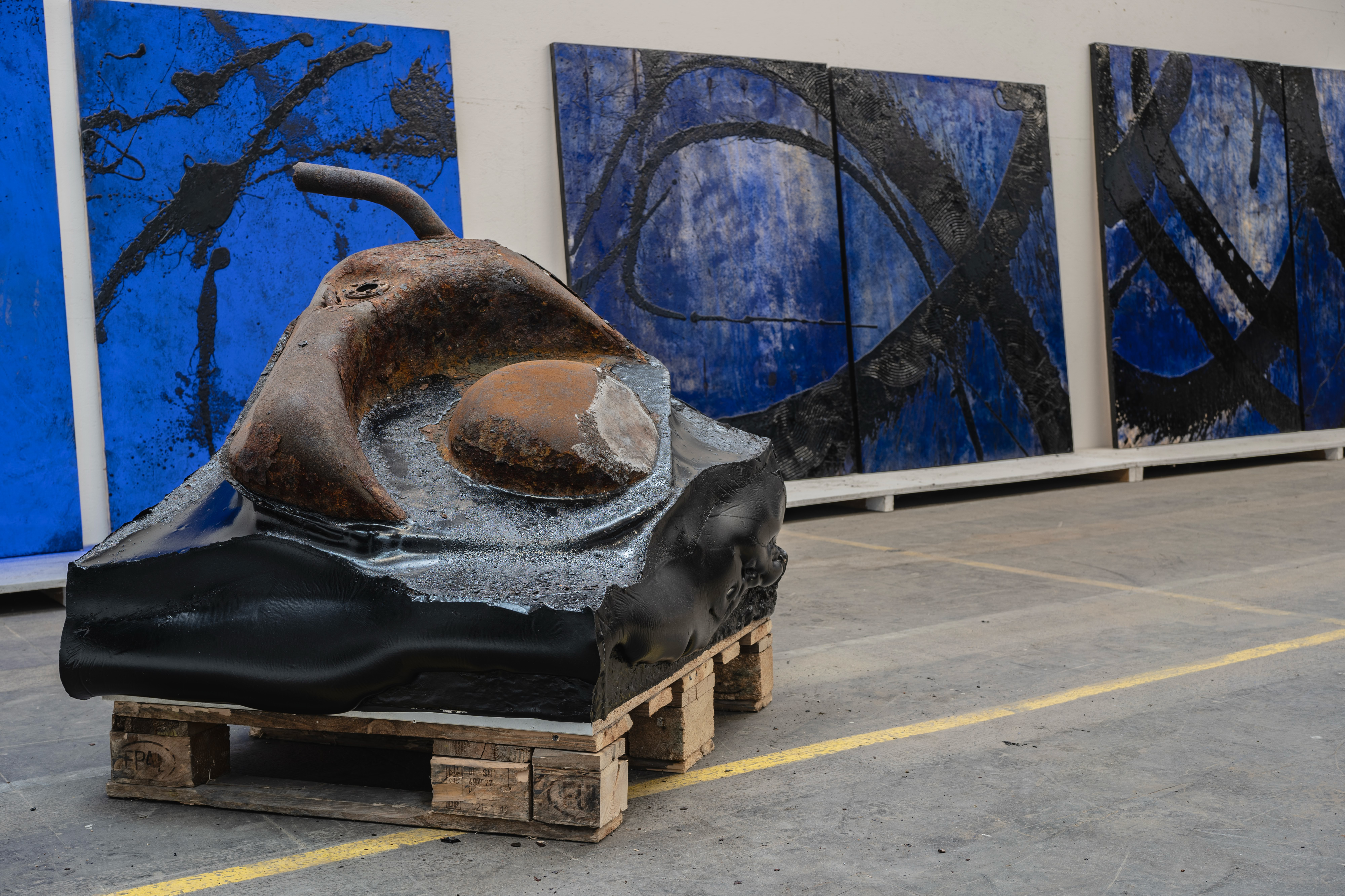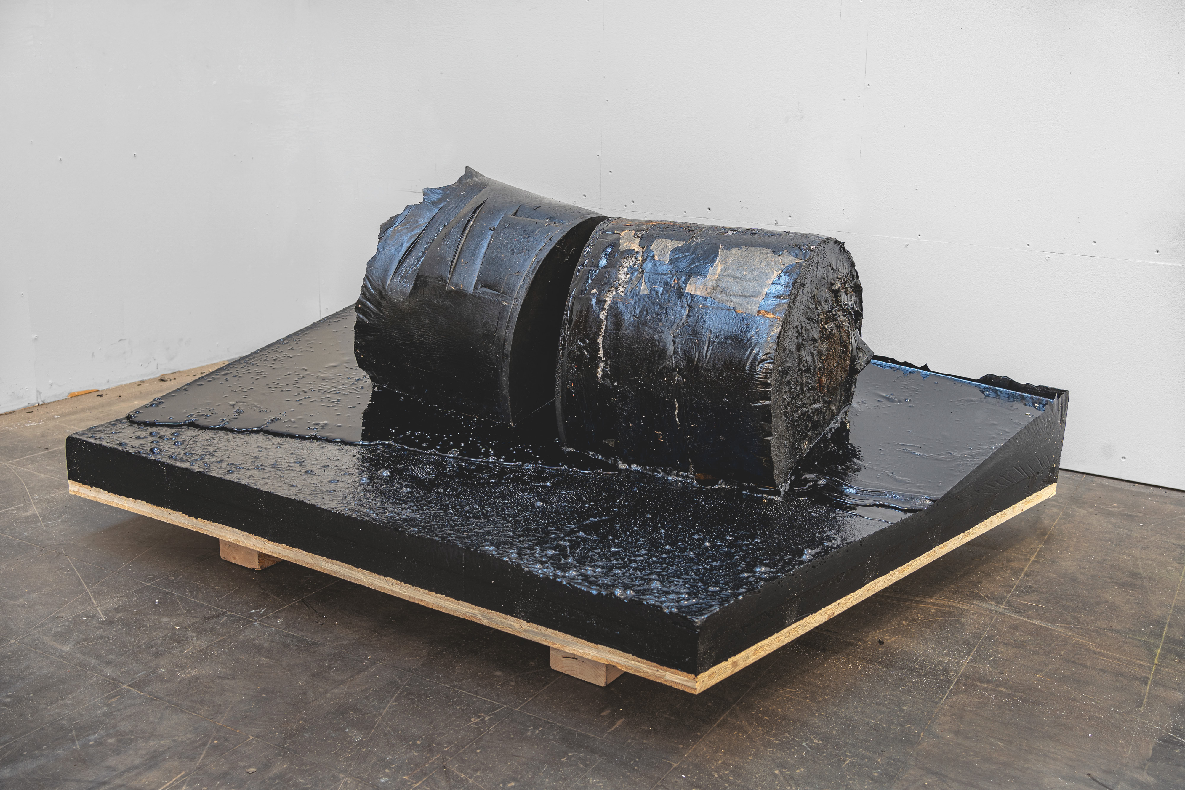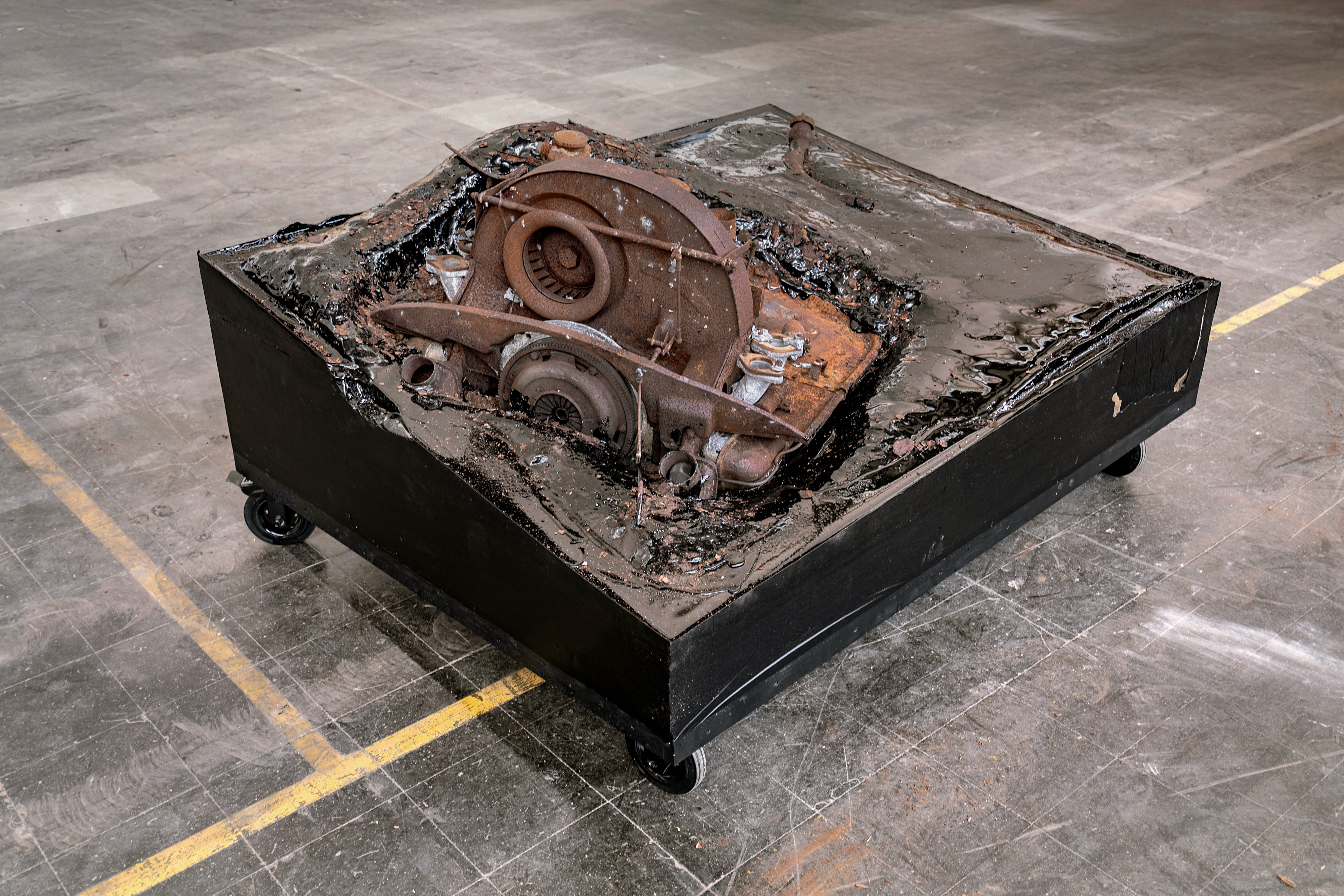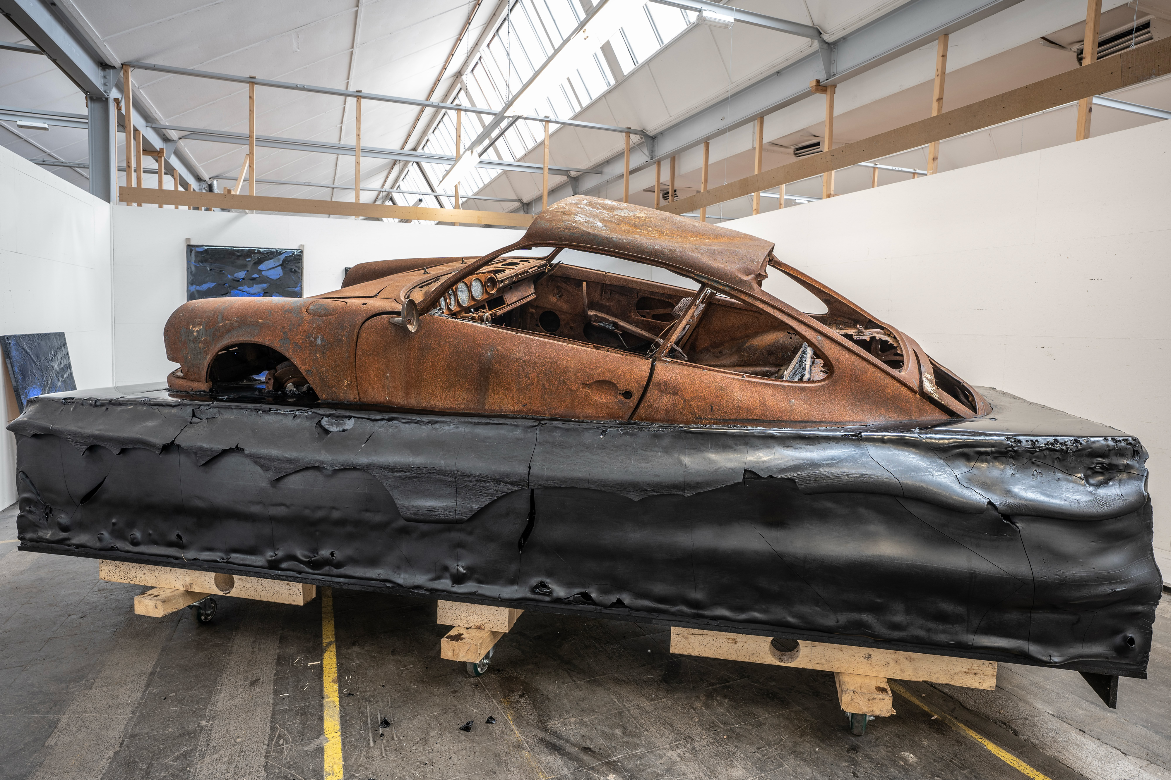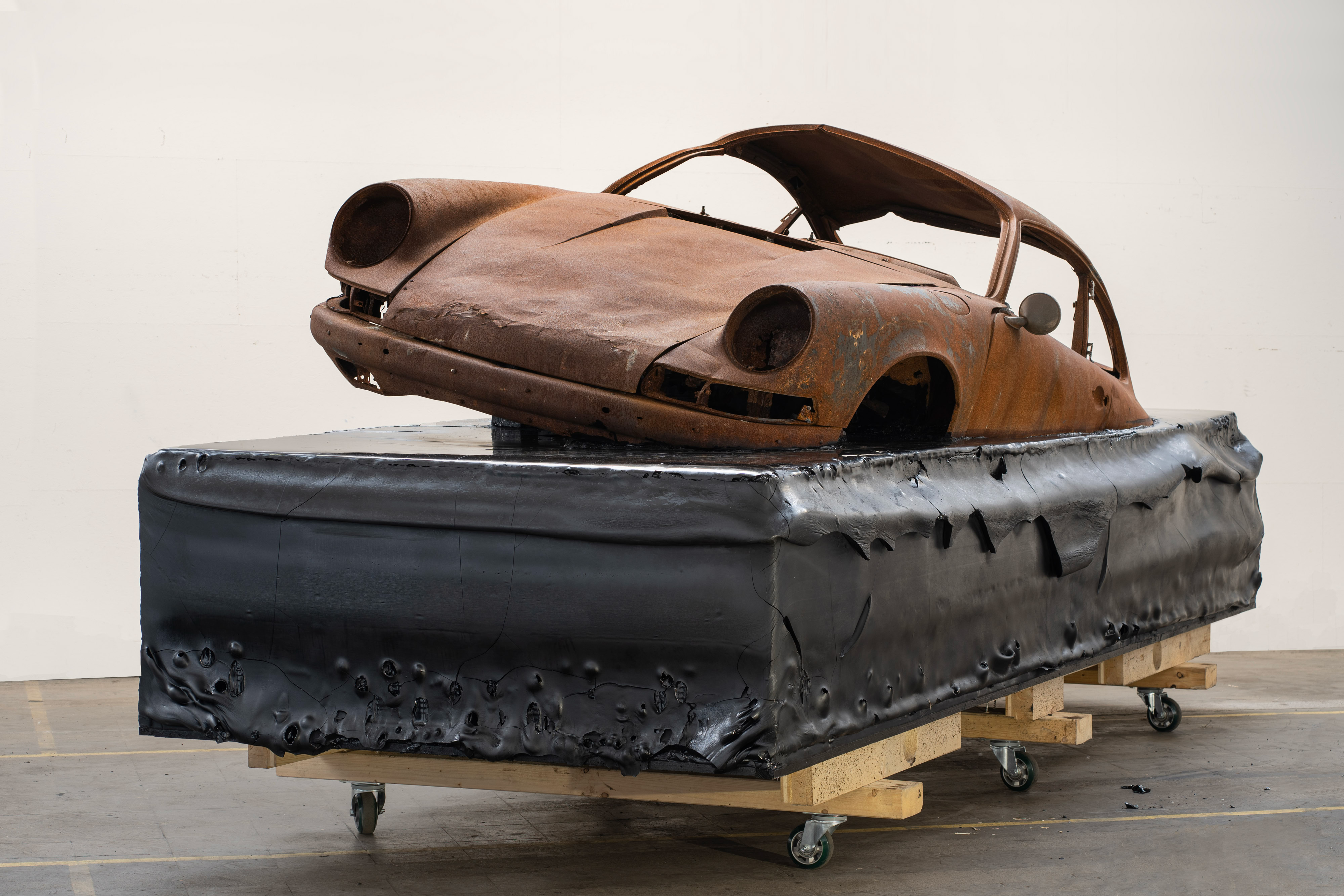 Die Kraft, die in der physischen, dreidimensionalen Asphalt-Installation steckt, ist fotografisch leider nicht abbildbar. Das Versinken eines rostigen Porsche 911 ist eine Metapher. Der Porsche, der als »Jugendlicher« über den Asphalt gerast ist, versinkt jetzt, im Alter, in ebendieser Materie, die seine schönsten Tänze möglich gemacht hat. Ein Kreislauf, der sich in allem irdischen und überirdischen wiederfindet.
