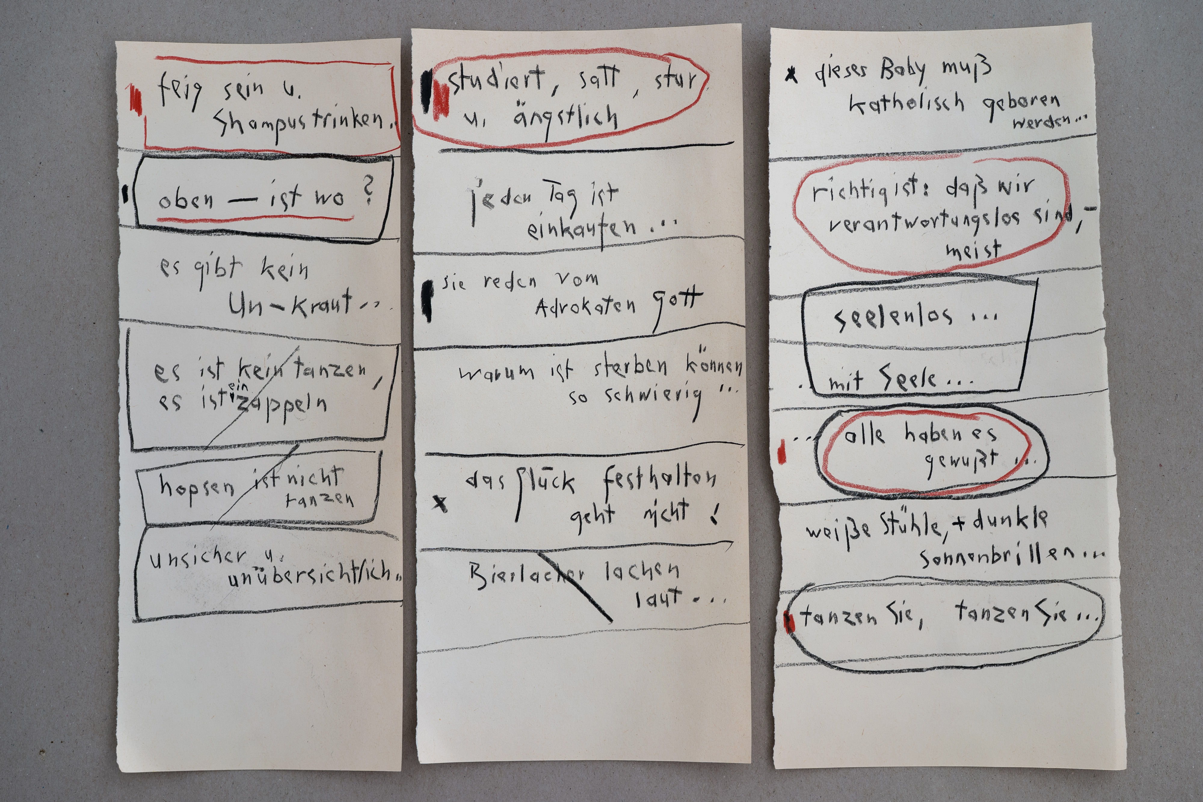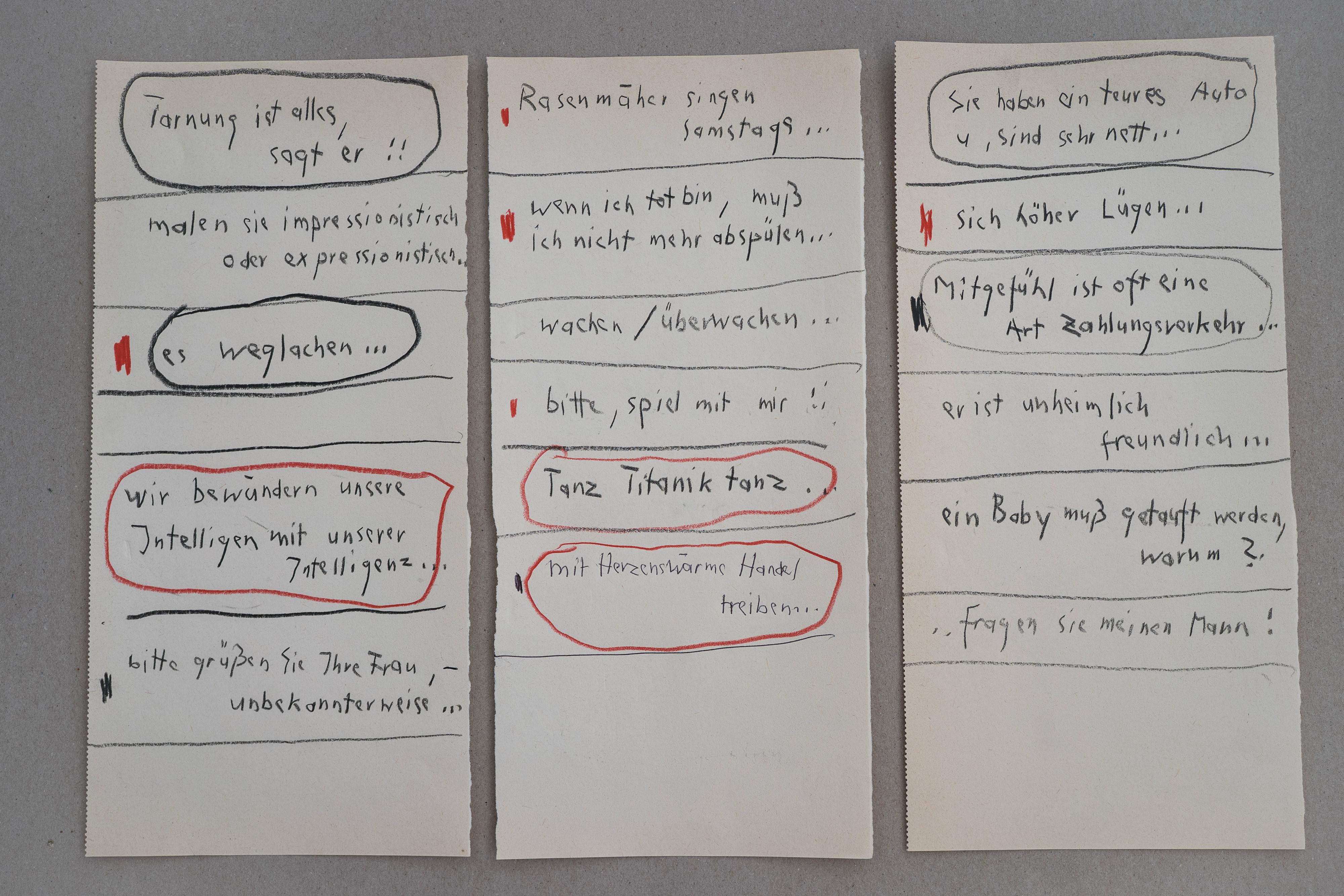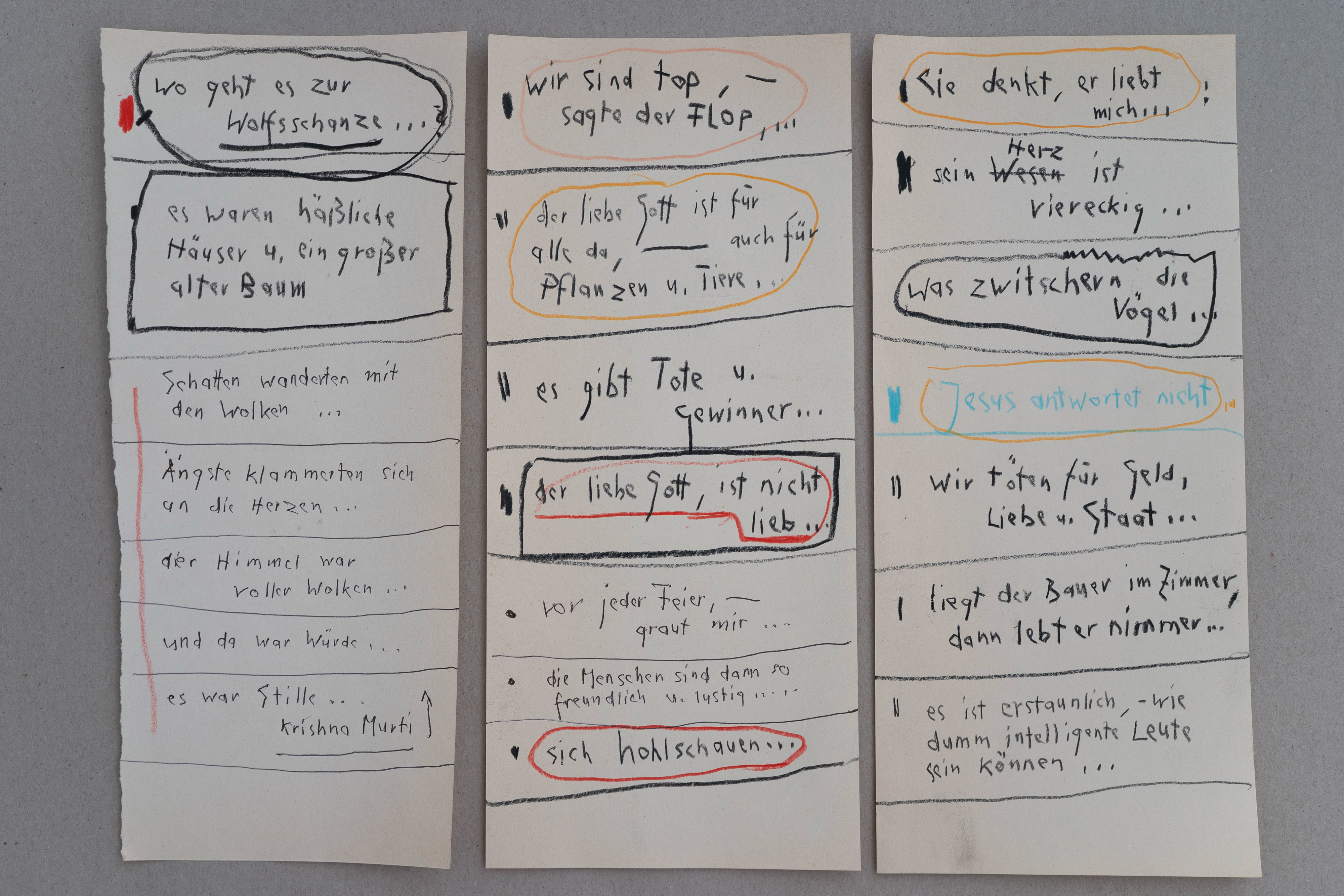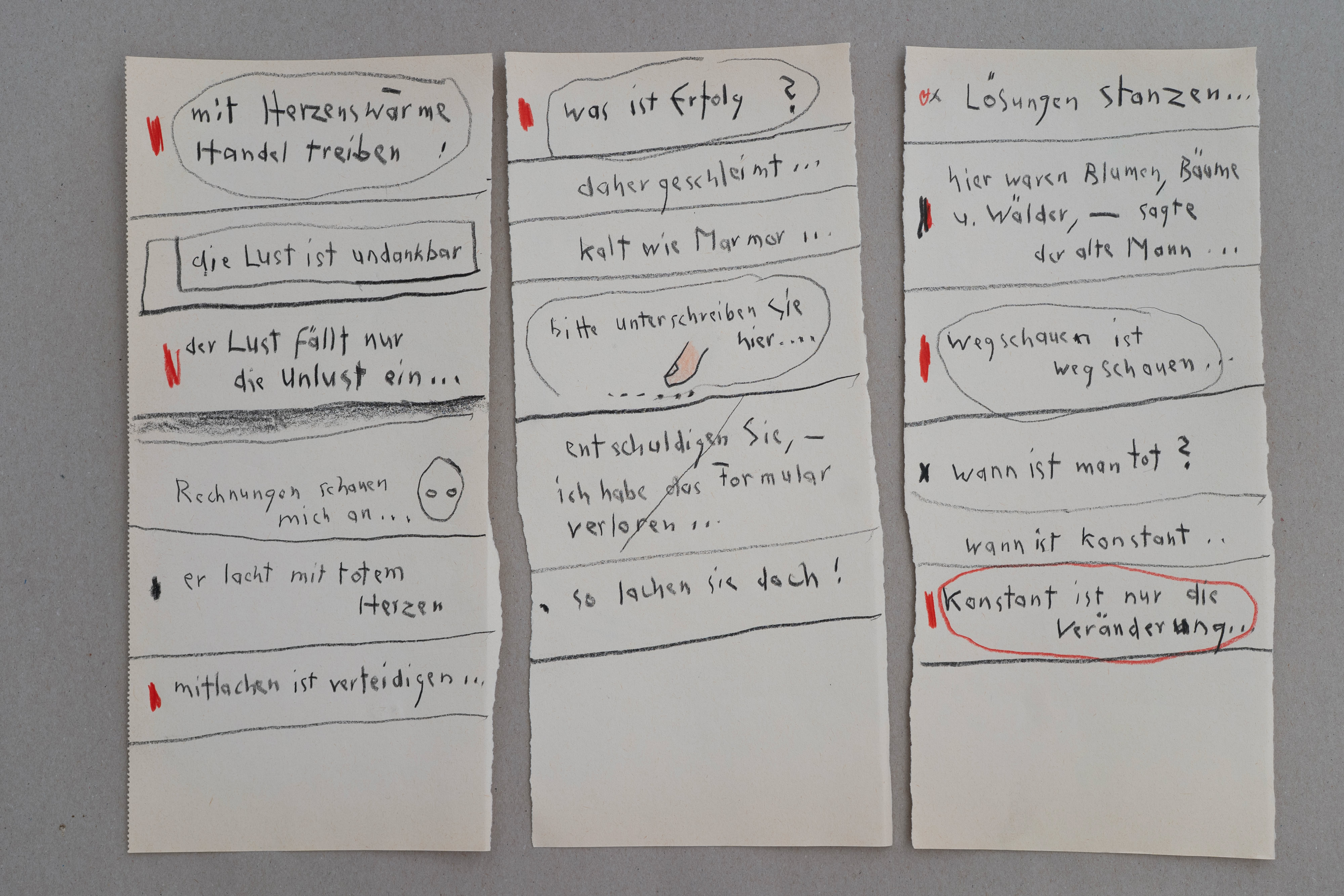»Ich liebe zu texten – während ich zeichne, quillen Gedanken und Textzeilen aus mir hervor – meistens schreibe ich sie auf, ohne darüber