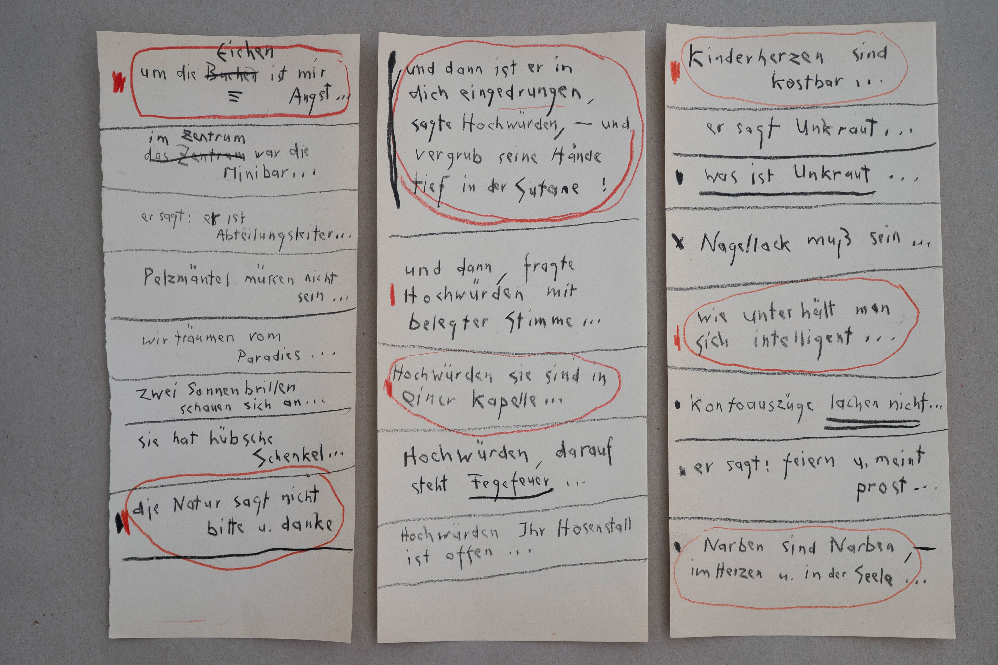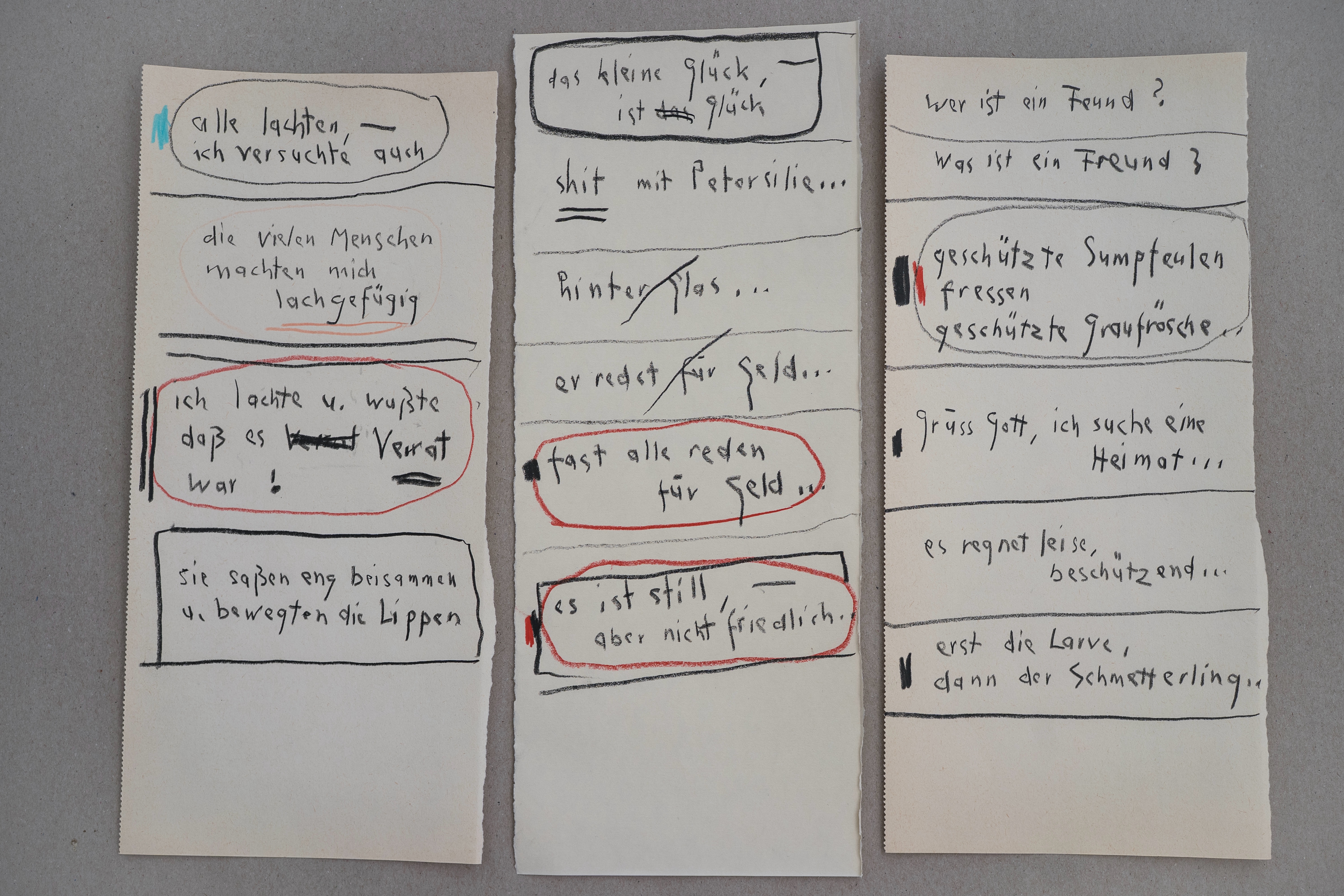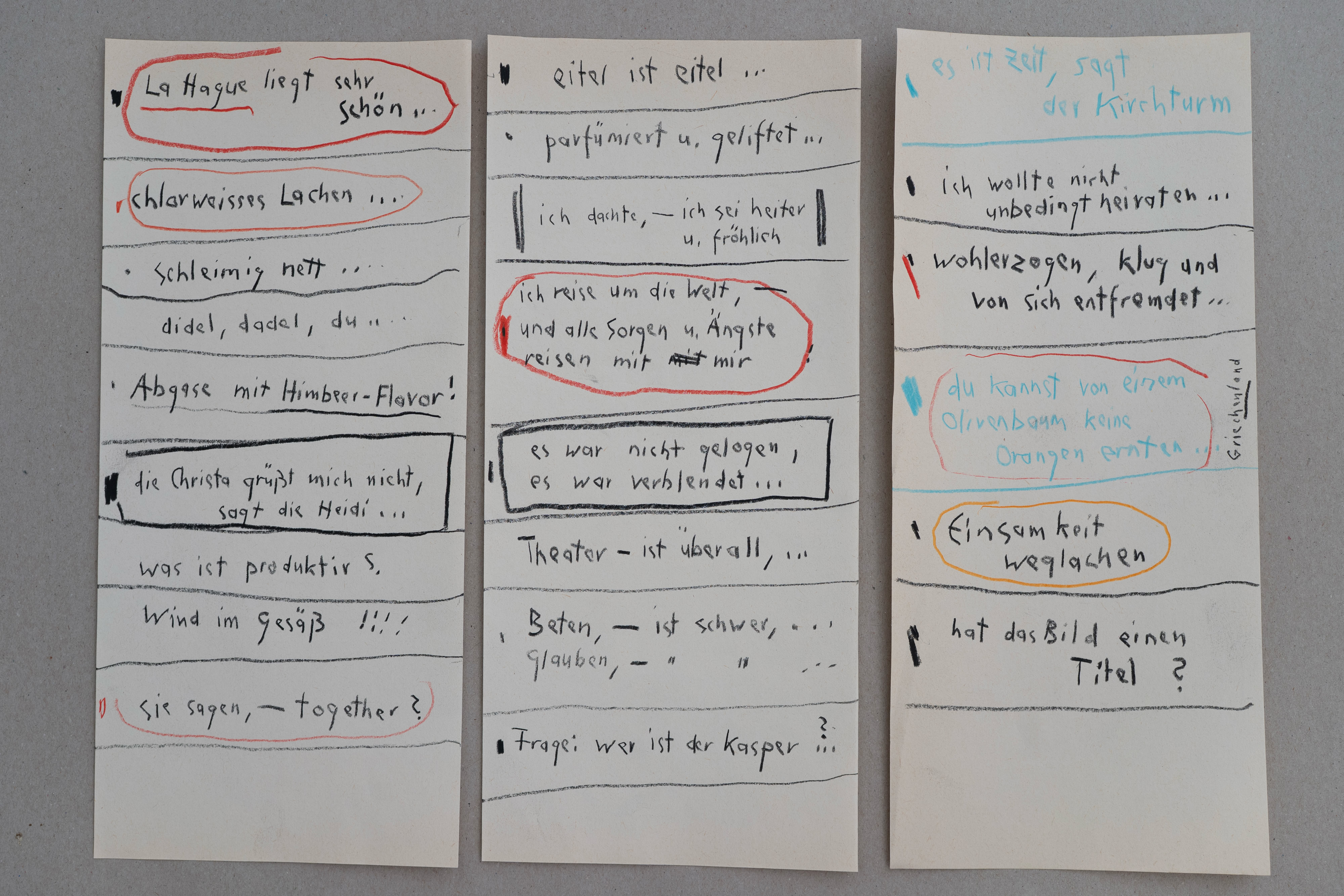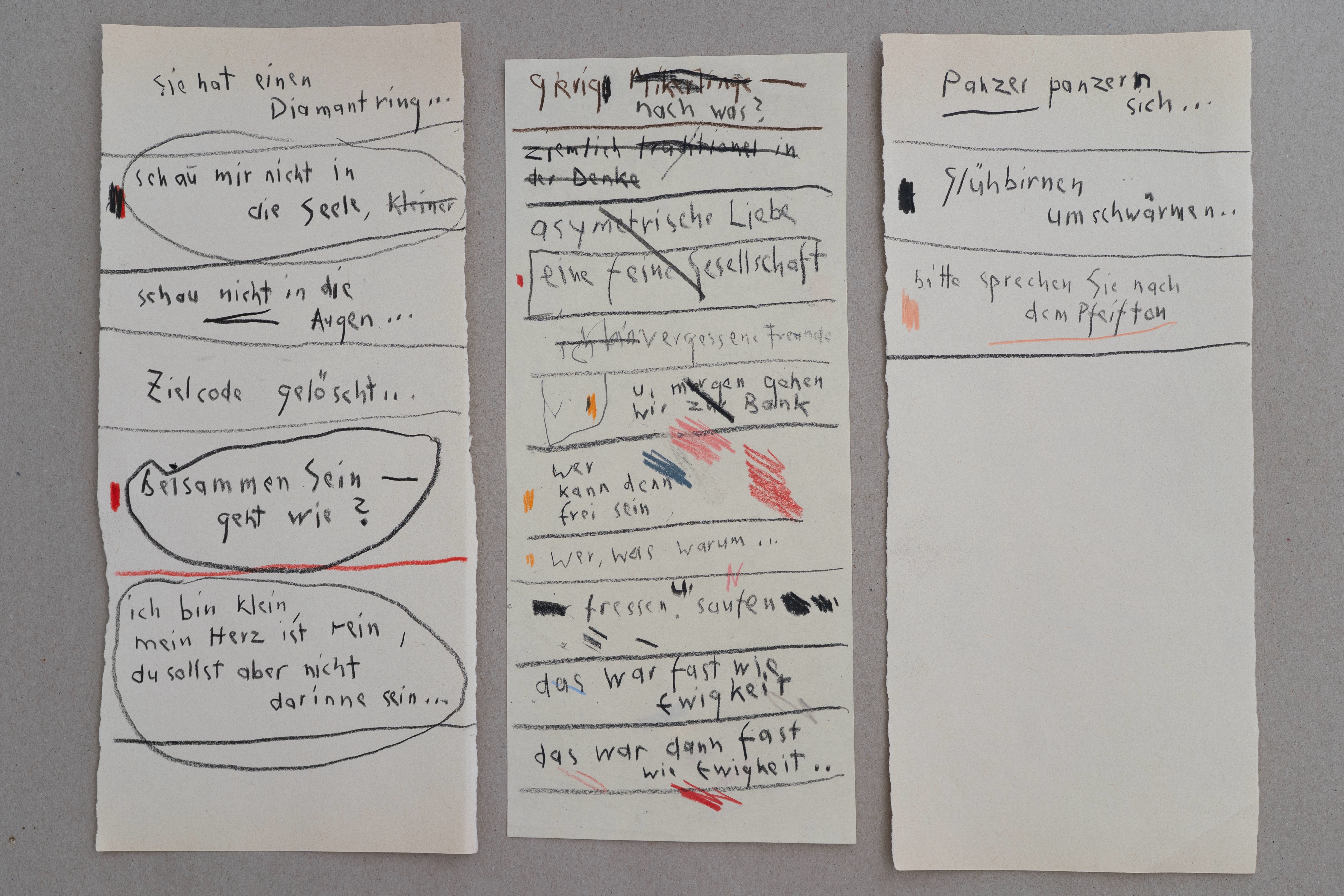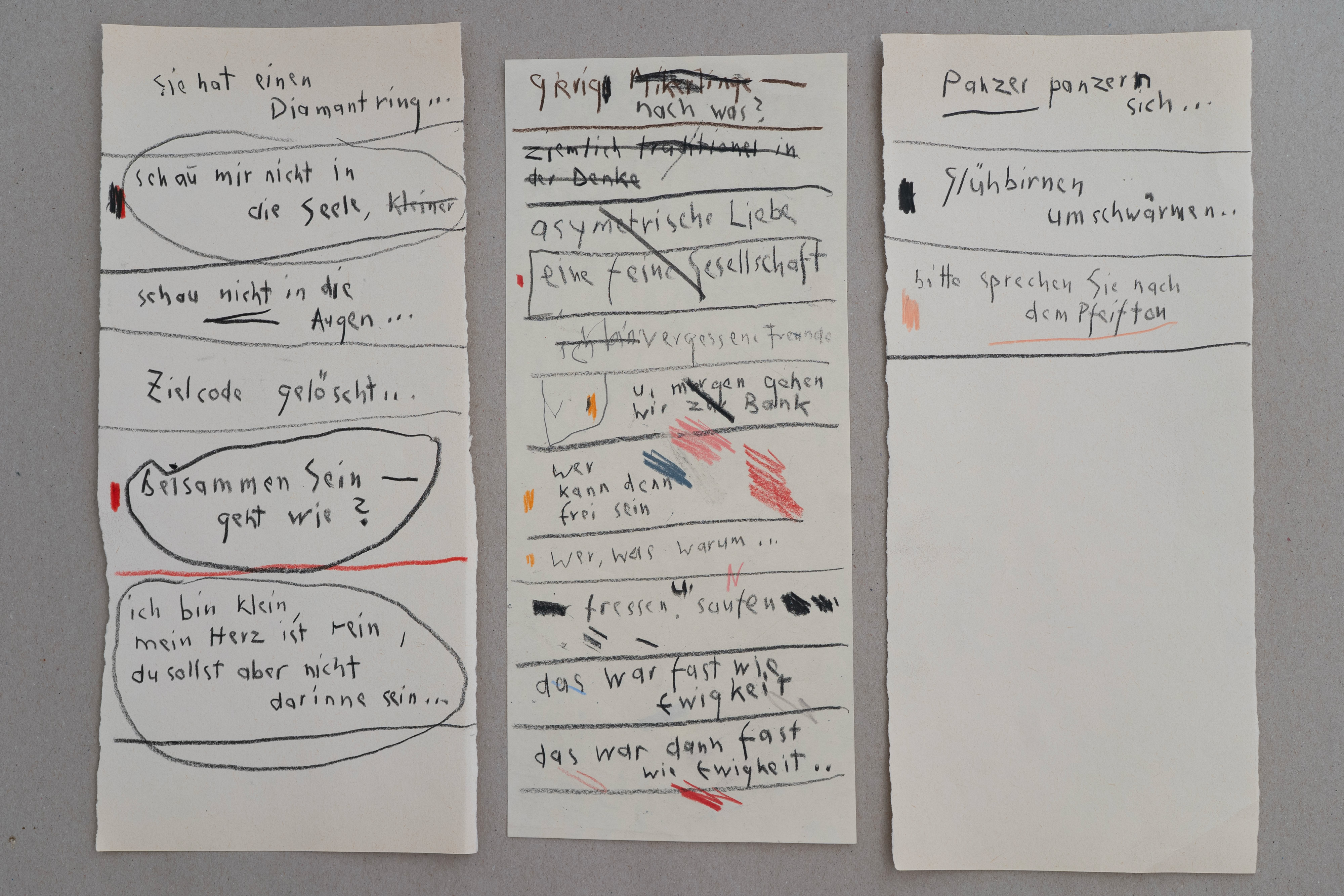 »Ich liebe zu texten – während ich zeichne, quillen Gedanken und Textzeilen aus mir hervor – meistens schreibe ich sie auf, ohne darüber